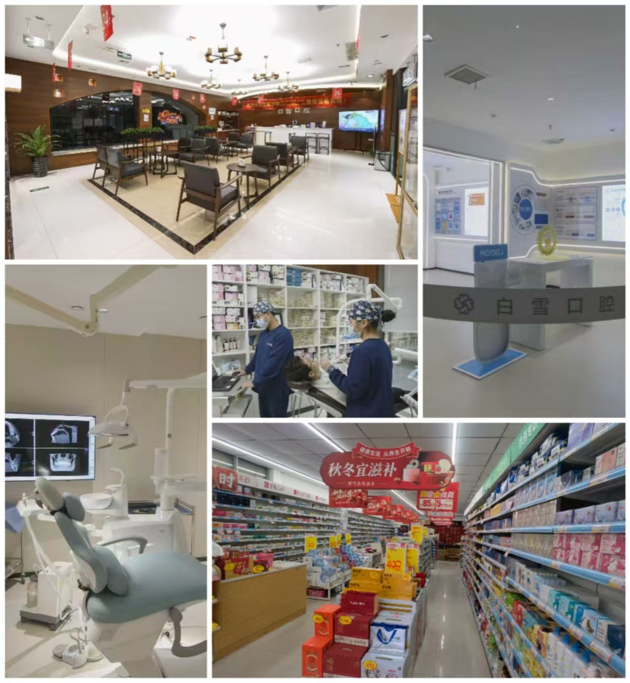 ---口腔药店守护居民健康防线。白雪口腔医院全新升级,门面焕然一新,配备专业诊疗设备与验光团队,提供牙齿矫正、日常护理等口腔全方位服务;高济百家药店则涵盖常用药品、保健品及健康咨询,为周边居民构建“小病不出街”的健康防线。
