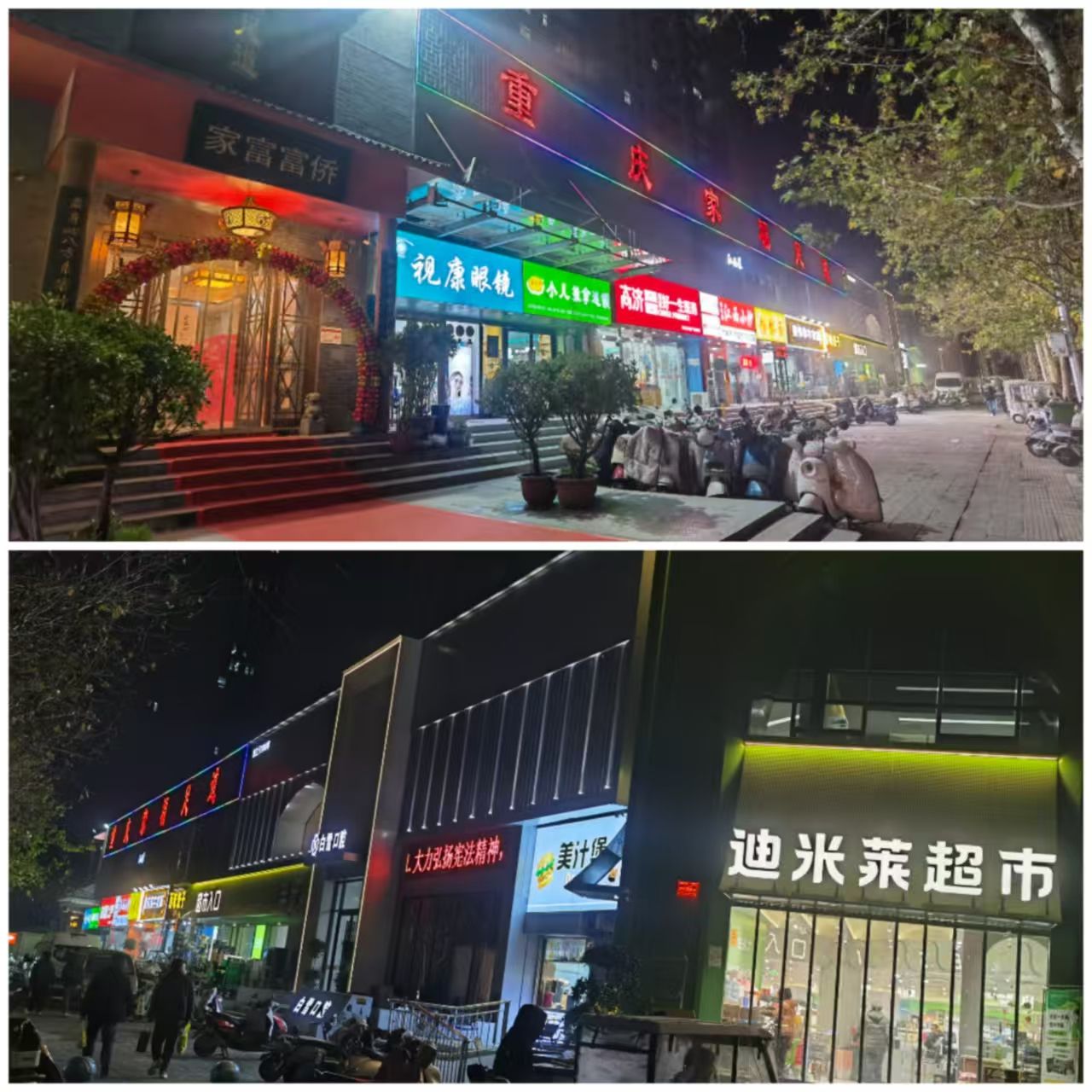 在外观打造上,商业街以“简约协调、活力有序”为设计理念,全面升级外观形象。浅灰色和浅绿色哑光外立面搭配统一规格的标准化店招标,既保留了各商户的特色标识(如超市的购物图标、口腔医院的专业医疗符号),又通过视觉统一性消除了以往商铺门头高低不一、色彩杂乱的问题。