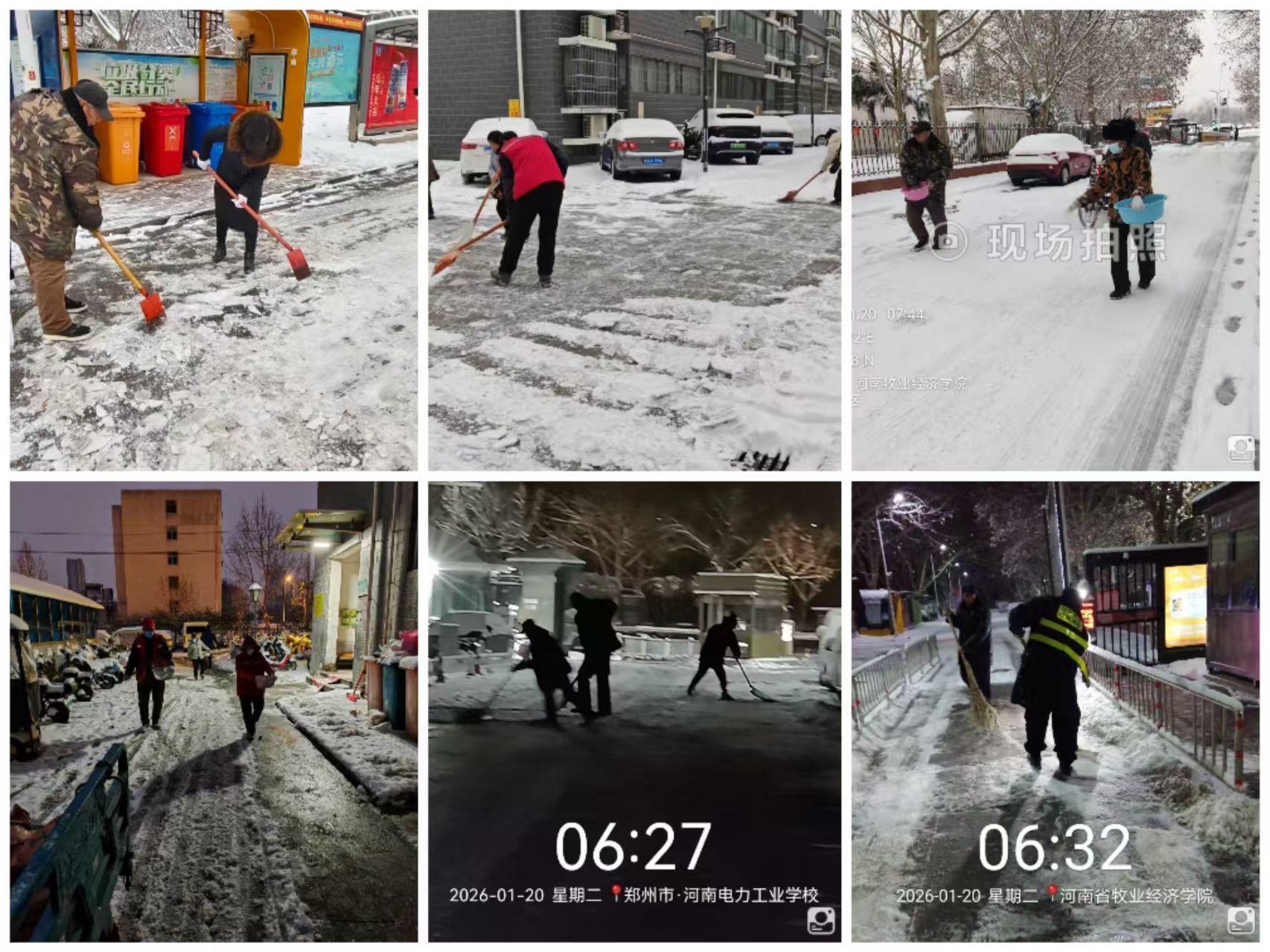 1月20日凌晨6点,五个教职工生活区物业人员全员到岗,按照“分片负责、重点突破”原则展开作业——主干道上,大家顶着零下8℃的寒风铲除结冰;单元门口,专人撒布融雪剂防止二次结冰。