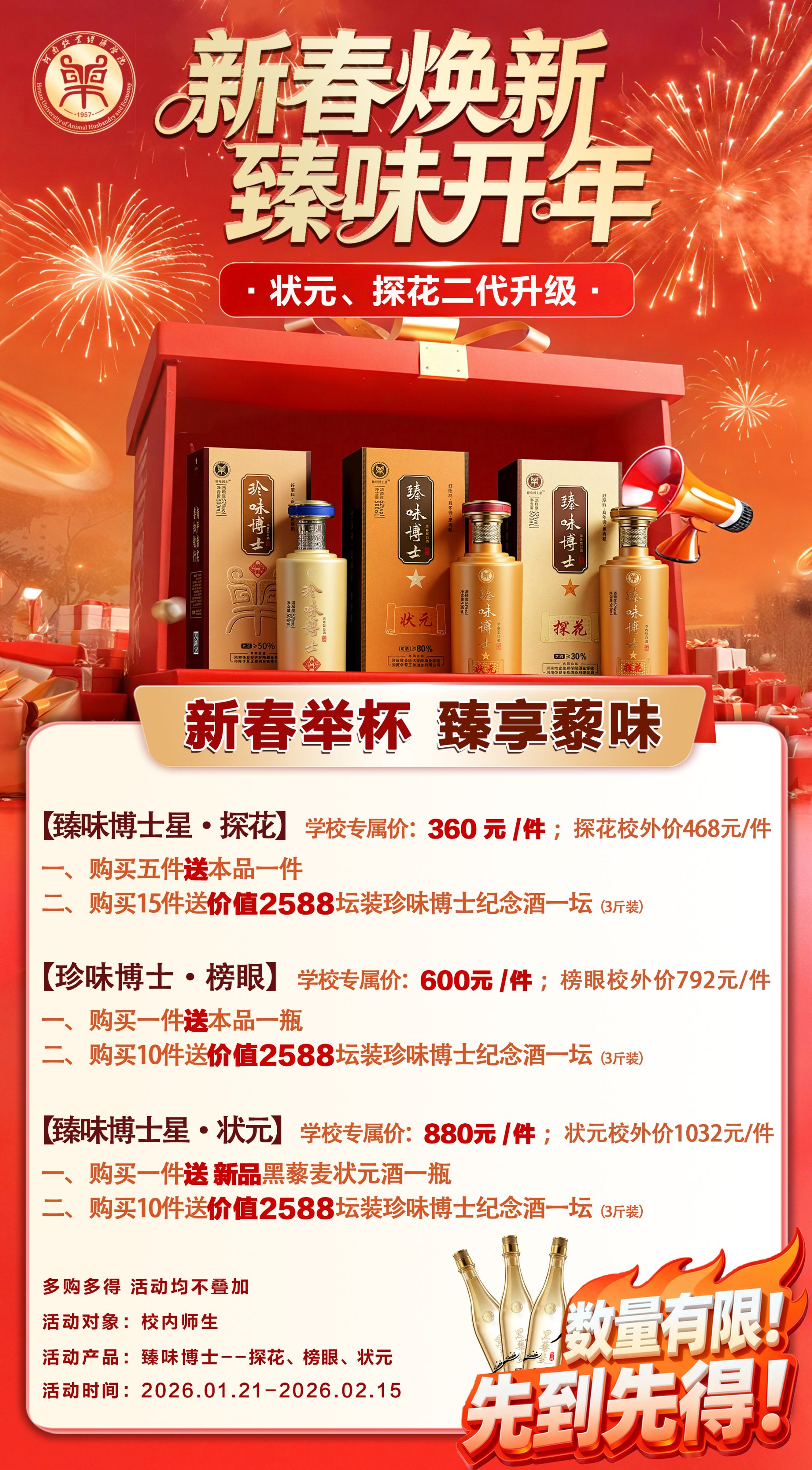 年味渐浓,佳酿相伴。臻味博士酒,作为河南牧业经济学院联合华夏酒业匠心打造的精品,在春节之际为您送上超值团购优惠。